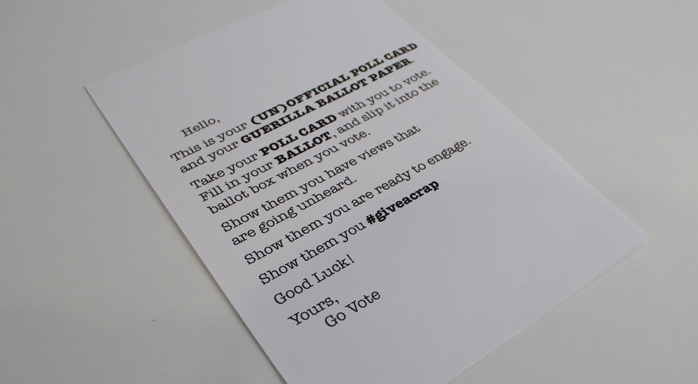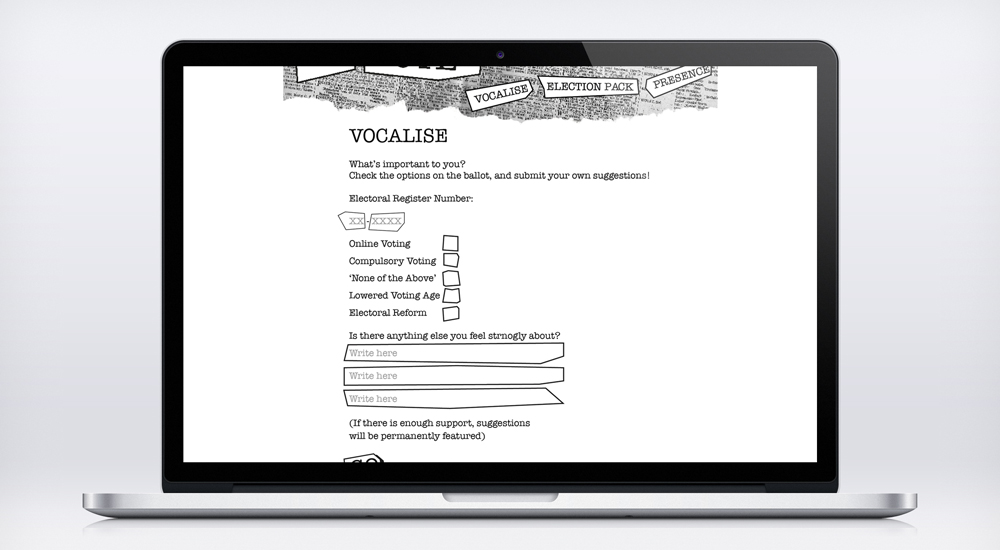 Further videos could be produced to inform in more specific terms. Supporting deliverables include Vocalise and a Guerrilla Ballot Paper, which go beyond simply voting and offer young people the opportunity to voice an opinion beyond simply selecting a representative on election day.