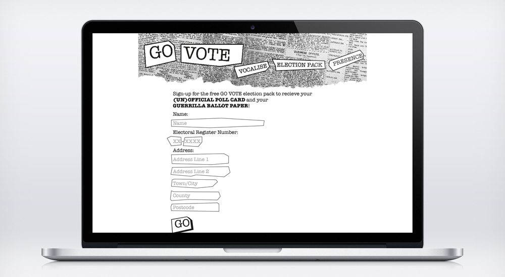 Go Vote is a campaign specifically tasked with engaging young people. The primary product is a video raising the issue of voting. This video covers politics in very broad strokes, and aims to inspire young voters with the confidence that their vote can actually matter.